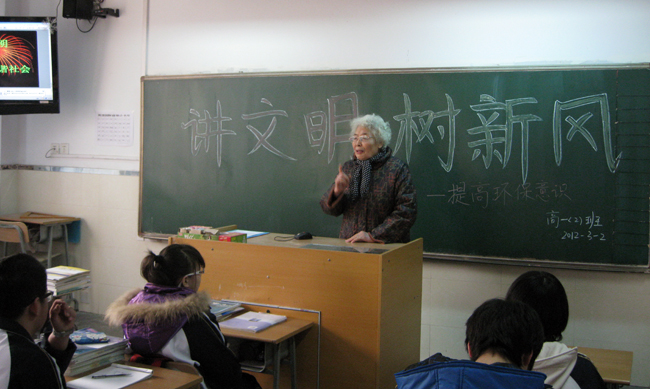 班会分为学生代表发言、同学分组讨论以及观看环境科普知识课件三个环节,全班同学纷纷表示从小事做起,从身边做起,培养一个良好的习惯。校关工委丁慧儒老师到会并讲话。她说,这个活动很有意义,教师教育学生要做一个真诚的人,学生的学习也应该首先学做人,学做文明的人,为国家和社会做出自己的贡献。