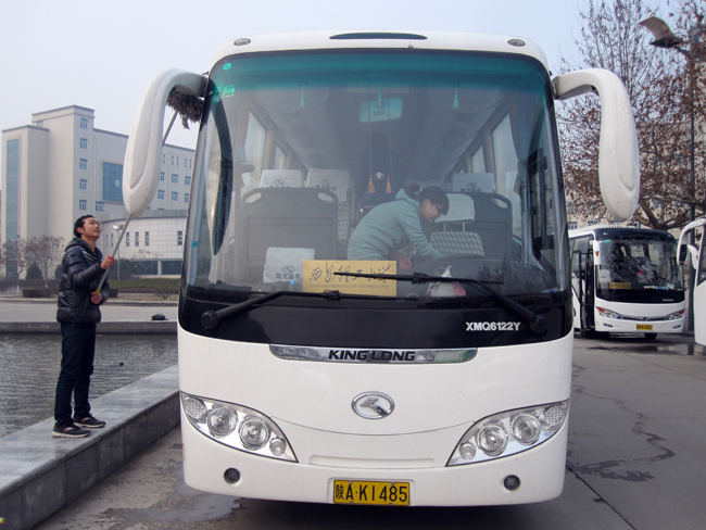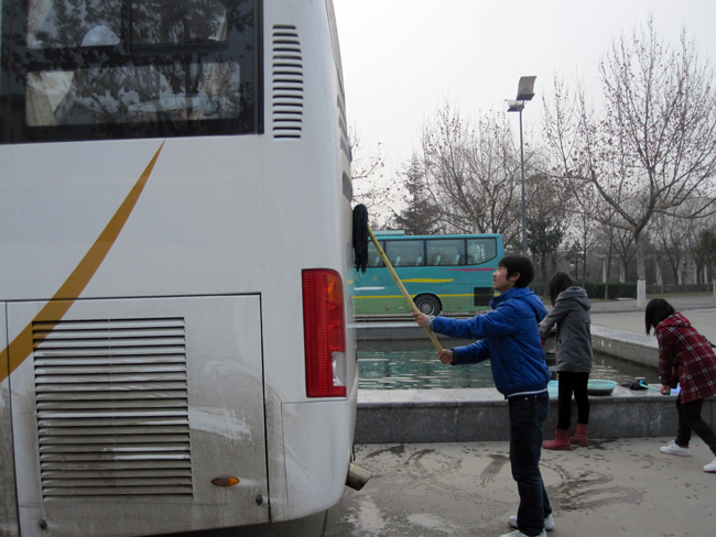 本报讯 3月3日清晨,由自动化学院电子113班举办的“学雷锋 我来擦校车”活动在曲江校区主干道举行。