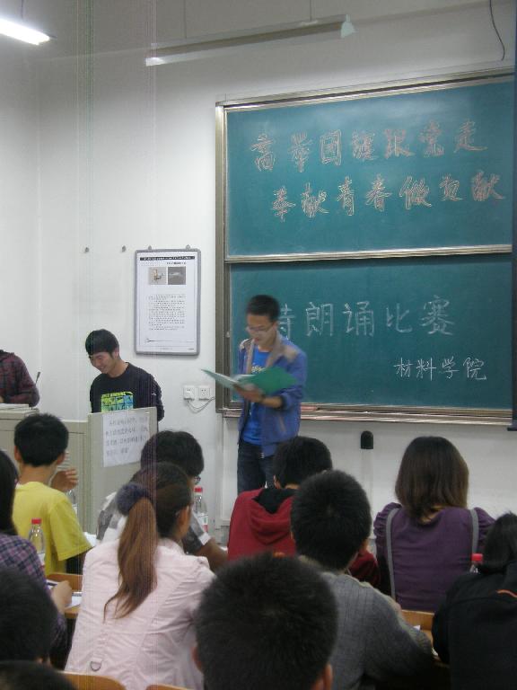 首先,主持人介绍了此次比赛的评委和计分规则,然后宣布比赛正式开始。比赛现场气氛热烈,同学们个个准备充分,他们以饱满的热情、激昂的语言把自己对党的感情表现的淋漓尽致。其中118班的李涛的演讲《中国魂》,以饱含激情的声音赋予了诗歌灵动与强大的感染力;材料102班的九人组合演讲《用生命铸就辉煌》,凭借出色地演讲与激昂的情感,赢得观众阵阵掌声,将比赛推入高潮;材料115班赵舒沛的《党旗下》更是以最真挚的感情,最洪亮的声音,最动人的情感完美的诠释了本次比赛的主题。最后,学生会主席梁云龙分别就选手的表现力,诗歌内容以及朗诵形式等各个方面进行了点评,充分肯定了同学们的表现,同时也指出在诗歌朗诵时节奏把握等方面需多加注意。