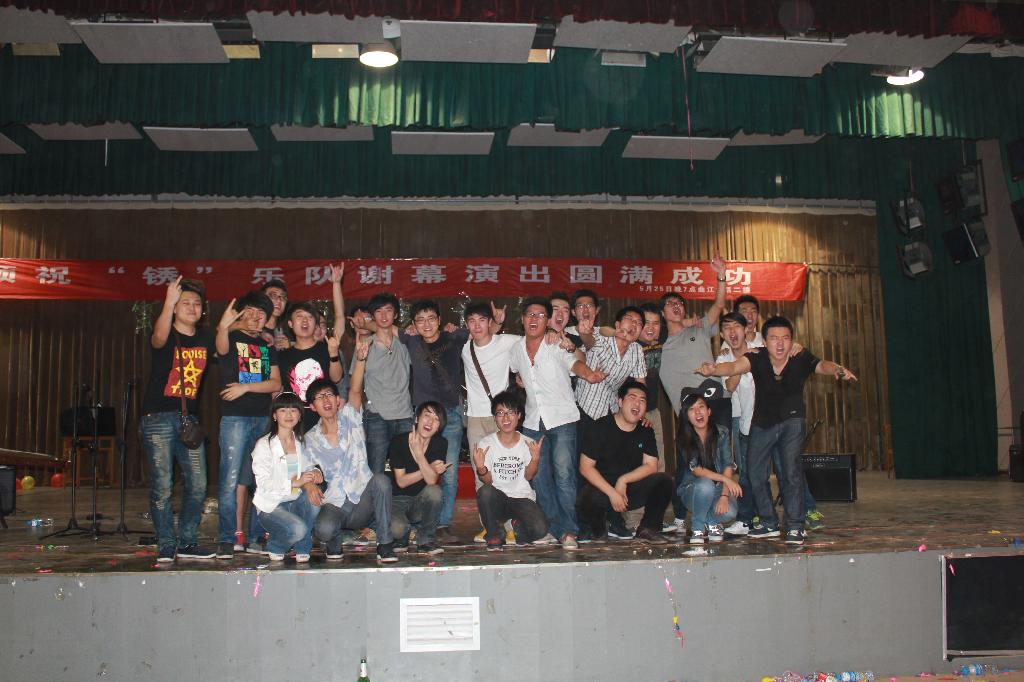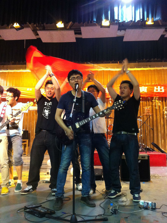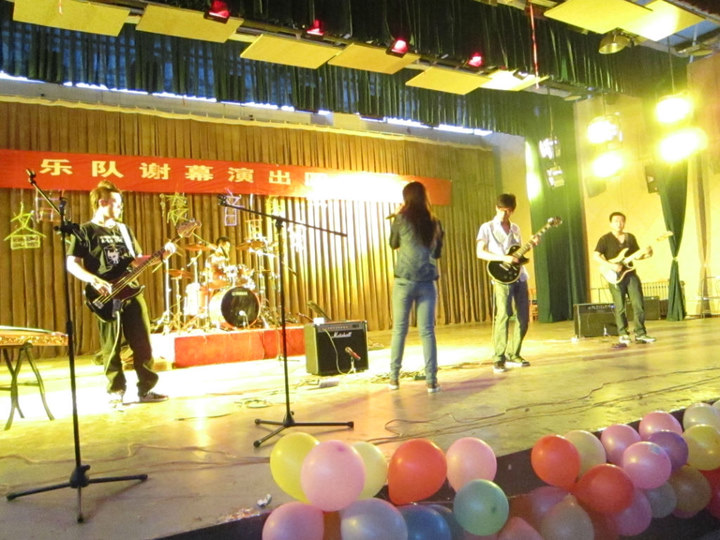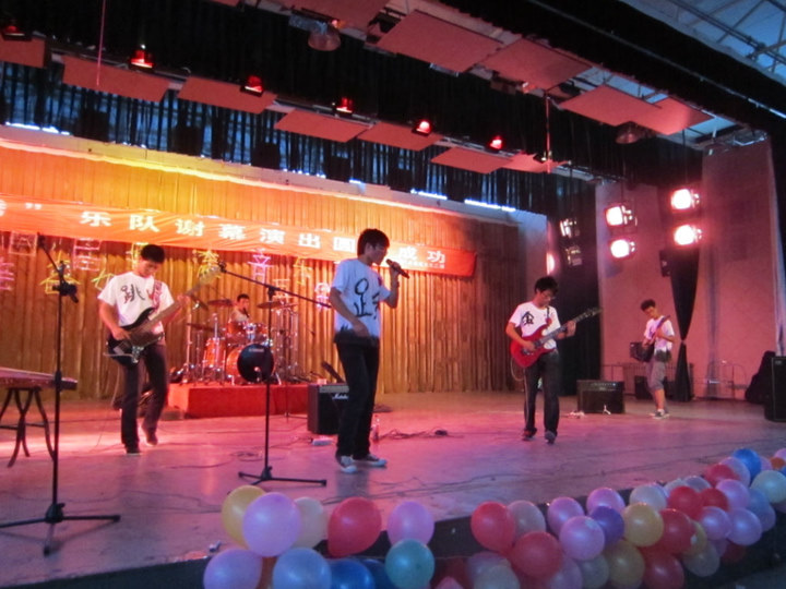 晚6点半,大学生活动中心热闹非凡,锈乐队、哓乐队、随意乐队、地下广场乐队和跳跃金属乐队的成员们陆续登台献艺。每个乐队为大家带来了三四个节目,歌手们不时与现场观众互动合唱,挥手打拍子,绚丽的灯光,精彩的表演,现场气氛异常火爆。