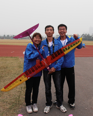 电动滑翔(P5B)A组队员在比赛后展示自己设计的滑翔机