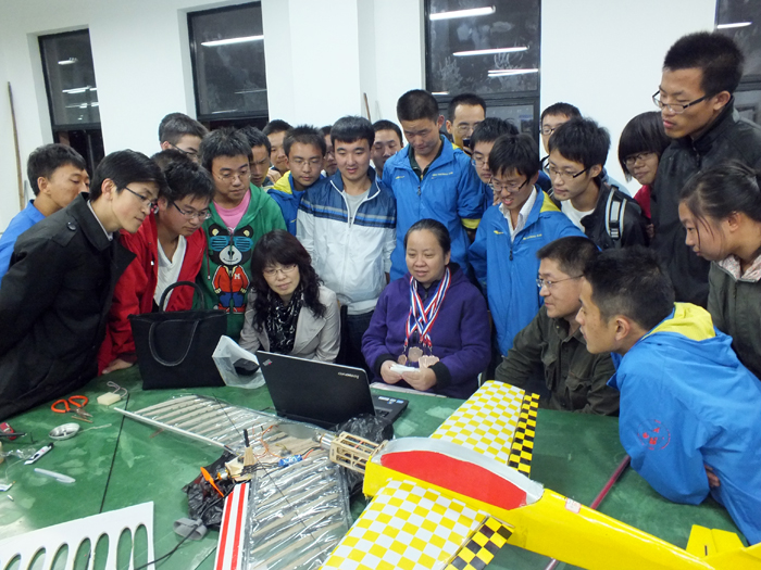 航模队队员回到学校以后和朱虹老师(前排右三)分享比赛成果