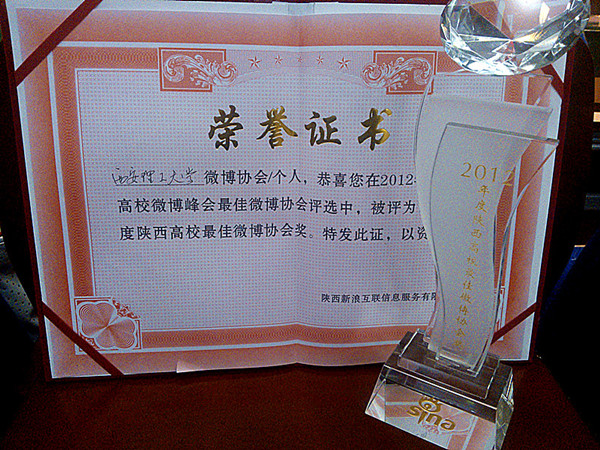 随后,峰会又陆续颁出了其余的奖项,最终,最佳教务微博奖项被被西京学院官方微博夺得。2012年度陕西高校最佳微博协会被西安理工大学微博协会夺得,2012年度陕西高校微博协会最佳运营奖由西安欧亚学院微博协会获得、2012年度陕西高校微博协会最具潜力奖颁发给了陕西邮电职业技术学院微博协会、2012年度陕西高校微博协会最具人气奖被长安大学微博协会夺得,而2012年度陕西高校微博协会优秀奖最终由西北大学微博协会与西安邮电大学微博协会夺得。