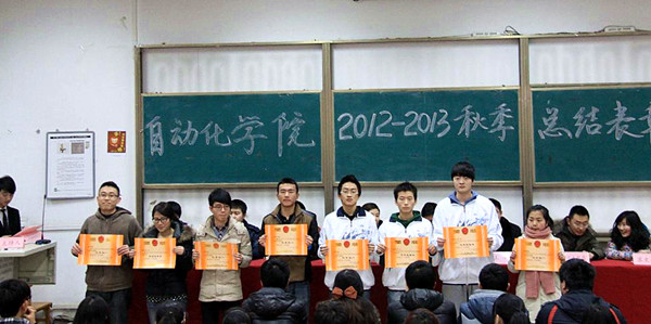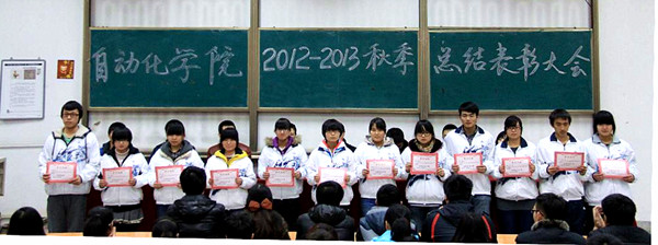 大会由自动化学院制作的学生会工作年终总结视频拉开帷幕,各个部门通过宣传片展示了自己的部门特色和自动化学子的风采,学院领导和学工办的各位老师也在视频中发表了寄语。随后自动化学院团委学生会主席李霁晨同学做了2012学年学生会工作总结报告,报告中指出本学期学生会在学风建设、特色工作和成员培养上的卓越成绩,并且了感谢所有关心和支持学生会工作的老师和同学们。之后,自动化学院副书记白华煜老师宣读了表彰名单,授予班长协会、组织部、宣传部、学习部、生活部“优秀部门”称号,授予自123、电气123、微电121“优秀班级”称号。由自动化学院学工办主任王林老师宣读了学生会优秀干部、干事名单。接着,自动化学院团委学生会优秀干事李雨菲同学代表获奖同学发言,感谢学院老师及各位部长们对大一干事学习生活等方面的关心和帮助,表示在近半年的学生会工作中受益匪浅,在今后的学习、生活、工作中会再接再厉,争取更大的进步。接着自动化学院团委书记尚婷老师发表讲话,尚婷老师对本学期为我院团委学生会发展与建设付出辛勤劳动和努力工作的全体学生干部表示感谢,对获得表彰的个人和集体的工作进行了充分的肯定并对学生会成员提出了几点希望和要求,希望学生会干部总结经验 ,认清身份,做好工作。