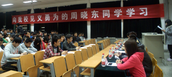 报告会上,周晓东详细介绍了事件经过,并谈了他当时的想法,此外,他向大一大二的学弟学妹们介绍了自己大学四年的学习生活经验,给他们提出了很多有用的建议。很多同学就自己理解的大学生见义勇为精神与周晓东进行了互动。