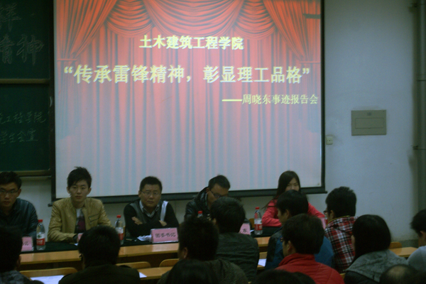 本报讯 3月4日晚7点,土木建筑工程学院在教10楼202教室举办了“传承雷锋精神,彰显理工品格”——周晓东事迹报告会。