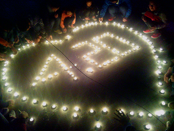 活动吸引了不少同学参加,其中还有一些小朋友。水院青协的成员点燃了摆成心形的蜡烛,并把心愿便利贴发到过往同学的手中,大家把自己对雅安的祈福写在上面,并粘在了展板上。然后同学们围在一起,默哀三分钟。
