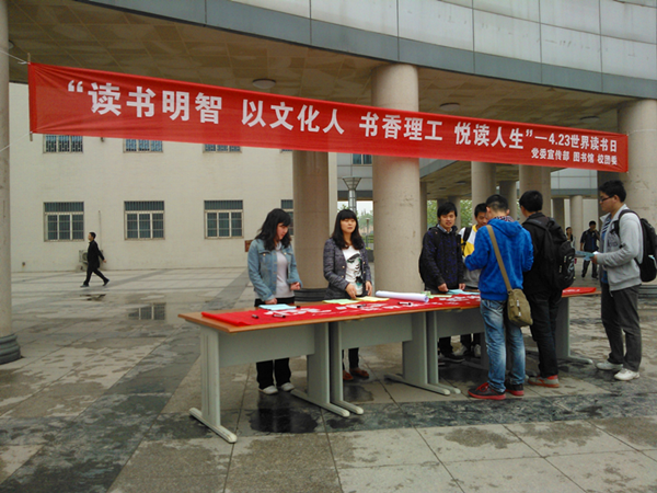 本报讯 今天,我们迎来了第18个世界读书日。党委宣传部、图书馆、校团委在曲江逸夫信息科技馆前向全校青年学生发出世界读书日的倡导活动。