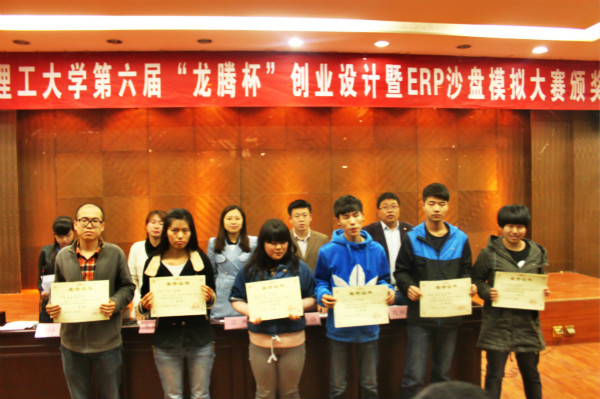 本报讯 4月3日下午4:00,经济与管理学院团委学生会于教11楼模拟法庭举办了第六届“龙腾杯”创业设计暨ERP沙盘模拟大赛颁奖典礼,到场嘉宾有经济与管理学院党委副书记兼副院长宗娜老师,经济与管理学院学工办主任赵玉强老师,团委书记朱晓明老师以及“优秀ERP指导老师”段刚龙老师。