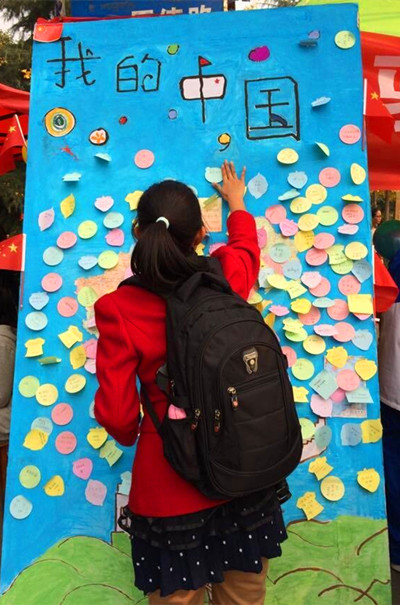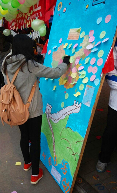 活动宗旨是号召理工学子拥有爱国意识,全方位的体会社会主义核心价值观的内涵,活动现场,媒体142班同学热情的邀请同学们参与其中,其形式是把自己想到的爱国口号写在小标签上贴在活动横幅上,之后同学们可以参与猜地名游戏,猜中后可以参与抽奖环节,奖品有饮料和糖果,该班同学说“通过本次活动,使得班级协调能力加强,班级内部更加团结,也希望通过活动收获到经验,使以后的活动尽善尽美”。
