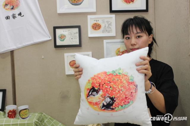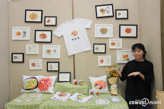 视觉传达专业的黎璟柔同学已布置好自己的展位,这个以《回家吃》为主题的展览,画的每一个家常菜里都有一个故事,让离家的人看了就想家的味道。黎璟柔同学把一道道家乡菜画在文化衫上、画在手机壳上、画在胸章上,画在抱枕上、画在明信片上……传达出浓浓的思乡情。