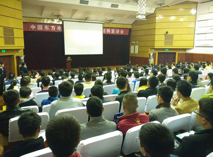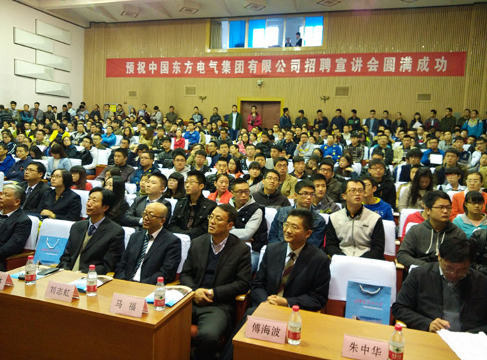 会议开始时,副校长刘凯向来到我校招聘的东方电气集团人员表示热烈的欢迎。紧接着,东方电气集团党组成员文秉友向在座的五百余名学生介绍了集团的行业地位,并鼓励在座同学积极应聘东方电气的岗位。随后,公司人力资源部部长傅海波介绍了到场的集团重要领导人,其中包括我校杰出校友,现任集团高级技术顾问的李世林先生。最后,傅海波部长播放了公司的发展历程短片,并介绍了到场的子公司概况以及招聘流程概况,欢迎各位同学前来应聘,整场会议圆满落下帷幕。