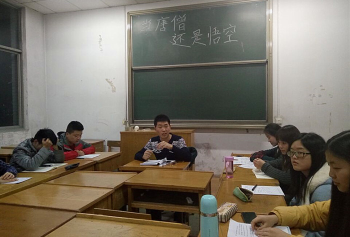 晚7点,正反方成员分别到达教室。首先,大家先对辩论的大致流程、规则等进行了讨论和说明,以免辩论中出现混乱。随后,辩论开始。首先由唐僧组一辩张弛提出论点,她提到:“唐僧作为取经团队的核心,一路上引领大家终成正果。所以,我们选择做唐僧。”紧接着,对方辩友提出论点,展开辩论。双方你来我往,针锋相对,甚是激烈。其中,唐僧组杨占鲁与悟空组郑云昕的对阵尤为激烈。双方你攻我守,毫不示弱,不过双方均沉着稳重,认真应对。