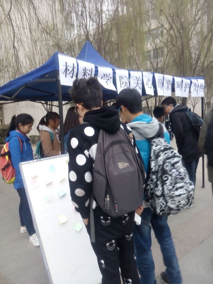 2016年3月8日,材料学院团委学生会实践部在曲江校区三餐厅前举办了以“关心母亲·呵护女性”暨迎三八妇女节的主题活动。本活动主要由爱心小贴纸、彩纸叠纸鹤、缤纷明信片三个环节构成。