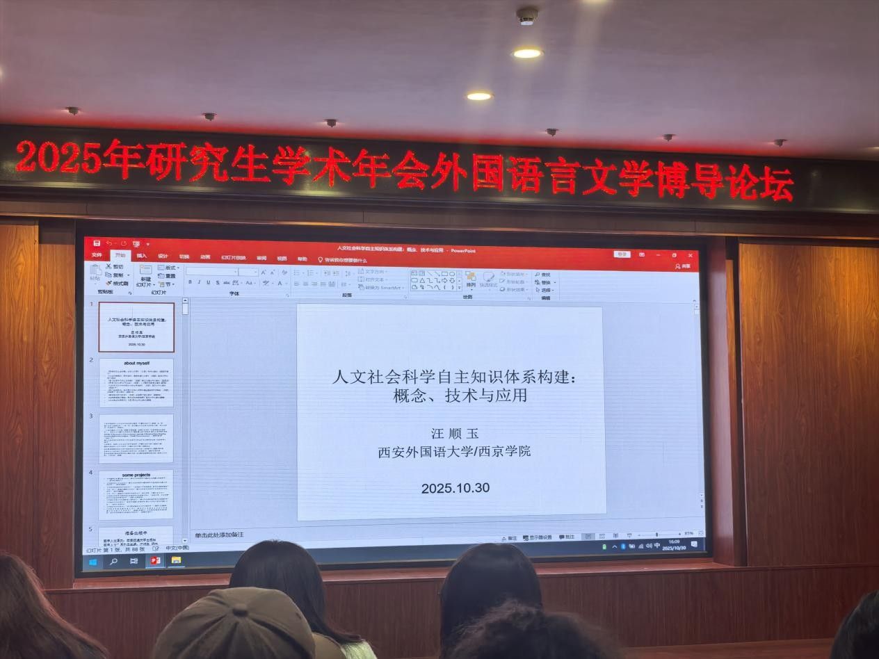 2025年10月30日下午,西安外国语大学汪顺玉教授应邀在人文与外国语学院模拟法庭开展题为《人文社会科学自主知识体系构建:概念、技术与应用》的学术报告。本次报告由黄勇副教授主持,众多对人文社会科学领域感兴趣的老师和同学到场学习,现场学术氛围浓厚。