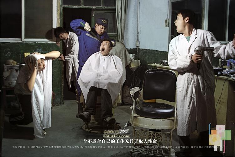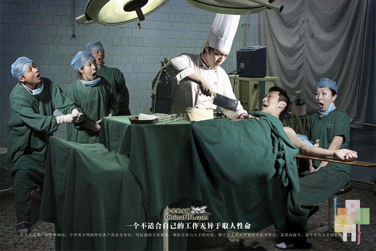 我的作品名称是《中华英才招聘网站创意广告》,本组作品共计5张,分别以不同的职业特征的反差来体现本组照片立意。作品意图表现出当你没有找到自己适合的行业和工作时所带来的严重后果这一主题思想,来为中华英才招聘网站做广告。分别通过拍摄园丁做了理发师,厨师站在手术台上充当主刀手术的医生,钳工当了拔牙的医生,警察站到了裁判席以及刷漆工来烤肉这些具有戏剧性的场景以及通过一种夸张、诙谐、搞笑的方式来警示和告诫大家:找一份适合自己的工作是一件非常重要不可怠慢的事情,否则后果不堪设想。正应了本组照片广告语:一个不适合自己的工作无异于取人性命。同时也告诉大家一个找工作的捷径就是到中华英才招聘网,中华英才拥有适合您的那份工作,等待您的加盟。