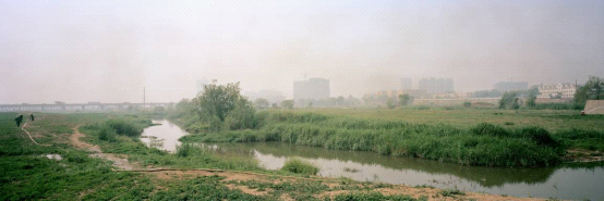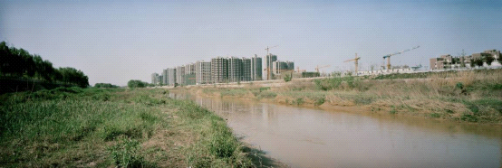 浐河:宽阔的河床的三分之二已长满了杂草,狭窄的浐河水旁屹立起了数栋建好的和正在修建的“生态”居民小区。