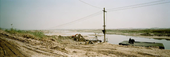 渭河2:高陵县泾渭分明渭处渭河段,在景点附近就有一处采砂石的工地,为了采砂机的运转在附近搭建起临时电线杆,和地面上无数条货车轮胎印记不禁发人深思。