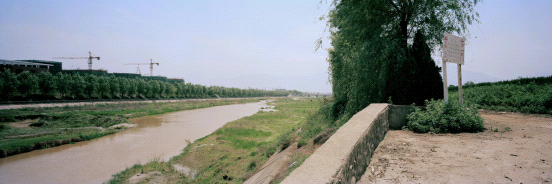 涝河2:户县县城依秦岭山傍涝河水,河水两旁很快就建起来众多商品楼。旁边年久的“水深禁止下河”的警示牌与河水的现状形成了鲜明的对比。