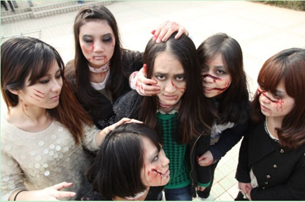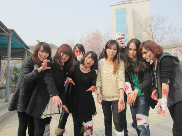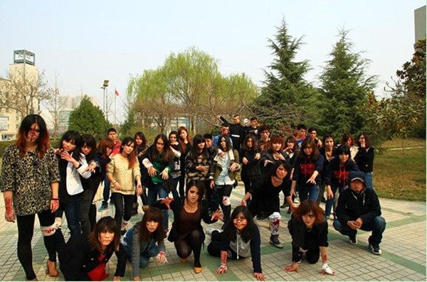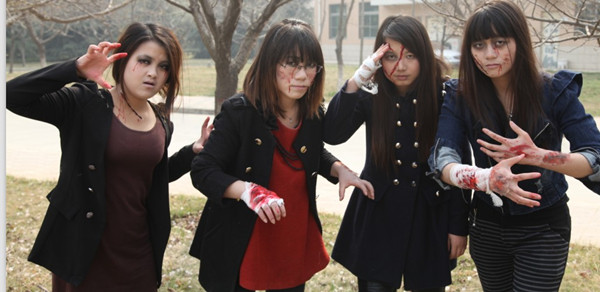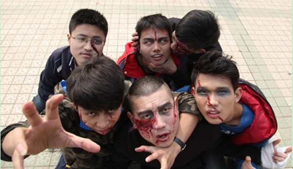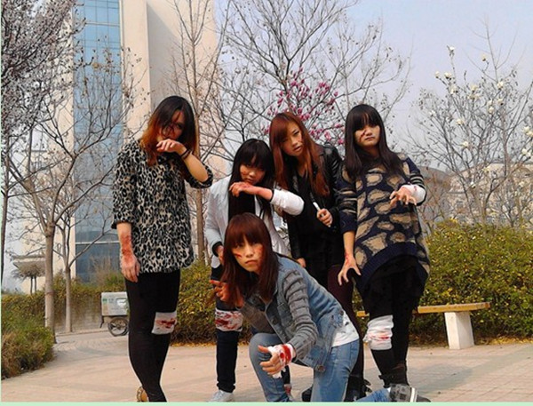 3月15日上午,由艺术与设计学院动画系同学自发组织的丧尸coseplay秀在曲江校区教九楼旁的小花园进行,35名同学画好丧尸妆,裹上绷带装扮成丧尸模样在小花园集合,摆出各种造型拍照,着实黑暗了一把。
