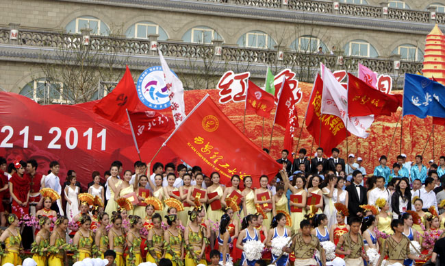 由陕西省教育厅主办,延安大学承办,西安音乐学院、西安教育电视台、西安理工大学和延安职业技术学院协办的“五月的鲜花·红色畅想”陕西省大学生优秀校园文艺演出活动于4月24日下午在延安大学窑洞广场举行。陕西省教育厅厅长杨希文、高教处处长袁宁、体卫艺处处长祝亚肖、延安市副市长冯继红、延安市政协副主席郭必选、霍满鹏以及承办、协办单位领导出席了本次活动并观看了演出。我校党委副书记杨萍带队参加了此次演出活动,并出席了组委会会议。