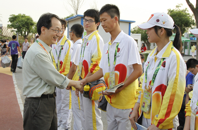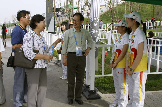 在前往世园会E区的路上,当杨萍副书记看到同学们在烈日下微笑认真地为游客服务,她欣慰地说:“你们辛苦了,我代表学校感谢你们!”李言副校长亲切地与沿途的志愿者握手,并询问所学专业和年纪,在了解志愿者和学习是否冲突的时候,他说:“学习肯定是第一位的,志愿者虽然是为大家为社会服务,但是学习是我们的本职工作,只有在不耽误学习的情况下,做好志愿者服务,才是最重要的。” 李言老师还强调,志愿者在践行岗位职责的同时也应当兼顾个人需求,注意休息和生活协调。