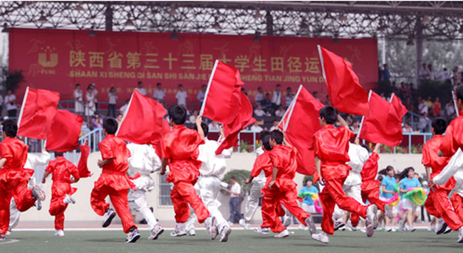 随后,西安理工大学800余名同学为大家献上了大型团体操《我们的校园充满阳光》。本次开幕式团体操由西安理工大学体育教学部创编,共分为《走向阳光》、《校园雄风》、《春色满园》、《再创辉煌》四大篇章。《走向阳光》寓意着我省高校体育事业蓬勃而出,光芒四射;传统武术棍术表演刚劲有力,舒展大方,扬我校园雄风;春色满园是对青春的美好祝愿,也是来自承办学校对四方朋友的最热情的欢迎;“继往开来、再创辉煌”则激励着我们顽强拼搏、奋发图强,去创造我省体育工作的新成就、新辉煌。