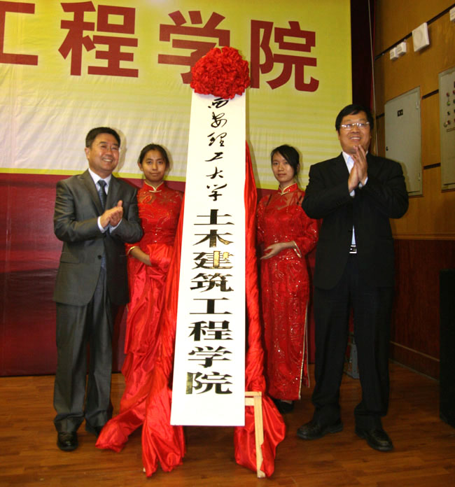 傅有明副书记在会上宣读了关于学校成立土木建筑工程学院的决定。郭立宏副厅长与周孝德书记共同为土木建筑工程学院揭牌。