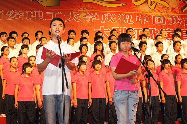 本次红歌演唱会邀请到了组团已有8个年头的陕西省高校教授合唱团作为开场表演嘉宾。一曲《北京颂歌》,气势磅礴,丝毫看不出这是一支平均年龄达70岁的合唱队伍;《天路》更是如天籁空降,博得了现场观众的阵阵喝彩。随后,比赛正式拉开帷幕。分别由校离退休办、思想政治理论课教学科研部、校后勤党委、图书馆、理工大子弟学校、校机关党委、理工晶科以及各学院的教师和同学组成的18支代表队依次登上舞台,为大家献上了一曲又一曲精彩的红歌。