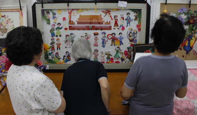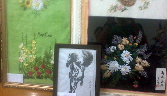 记者发现,并不宽敞的退休办书画室,参展作品却摆得琳琅满目,仿佛进入了一个艺术的世界。较为显眼的一副布贴画放置在正对的墙壁中央的位置,内容为天安门广场与56个名族的代表人物的卡通布贴画。据悉,这是全部参展人员分工合作共同完成的,是庆祝建党九十周年的特别献礼。另外还有两幅作品也引起了记者的注意。这是两幅贴画,栩栩如生,玲珑逼真,却看不出贴画的材质,经由负责人介绍才了解,原来是一位退休职工老大爷用两位孙子满月的胎毛加以艺术加工所贴制的,一幅是兔,一幅是马,正好是两位孙子的生肖,非常具有纪念意义,又兼具艺术欣赏价值。在记者采访过程中,书画室也是门庭若市,来观看的人络绎不绝,他们边看边交换着感想,气氛融洽和谐。