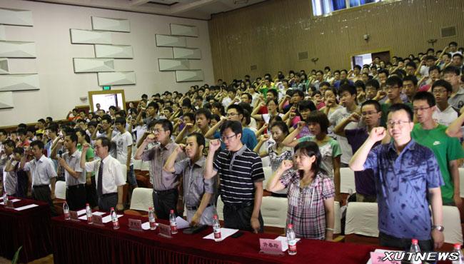 学生处处长马宁领誓,在鲜红的党旗下,300余名党员齐举右拳,庄严宣誓:“我志愿加入中国共产党,拥护党的纲领,遵守党的章程,履行党员义务,执行党的决定,严守党的纪律,保守党的秘密,对党忠诚,积极工作,为共产主义奋斗终身,随时准备为党和人民牺牲一切,永不叛党。”表达了为共产主义事业奋斗终身的信心和决心。