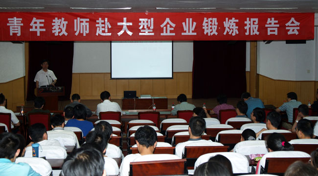 我校近日在教六楼科技报告厅召开了青年教师赴大型企业锻炼报告会。刘丁校长、刘军副校长、教务处、科技处、实验管理处、校友工作处负责人、相关学院分管青年教师工作院长和青年教师以及2011年赴大型企业锻炼的青年教师参加了报告会。
