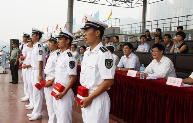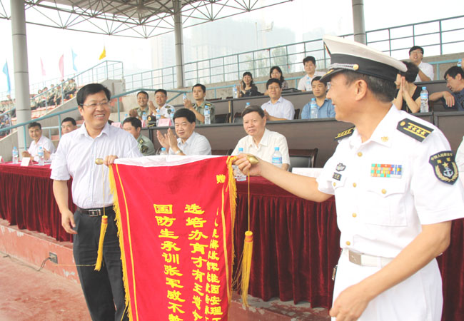 校党委书记周孝德向圆满完成承训工作的海军驻校后备干部选培办赠送了锦旗。