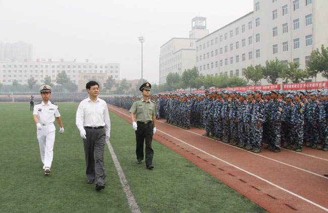 在军训旅教官的陪同下,刘丁校长检阅了受训新生。同学们个个精神抖擞,昂首挺胸,“首长好!”、“为人民服务!”的口号整齐有力,充分展示了当代大学生朝气蓬勃、奋发向上的精神风貌。