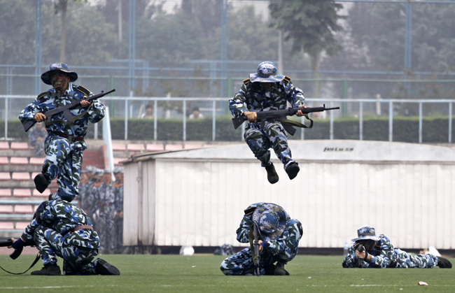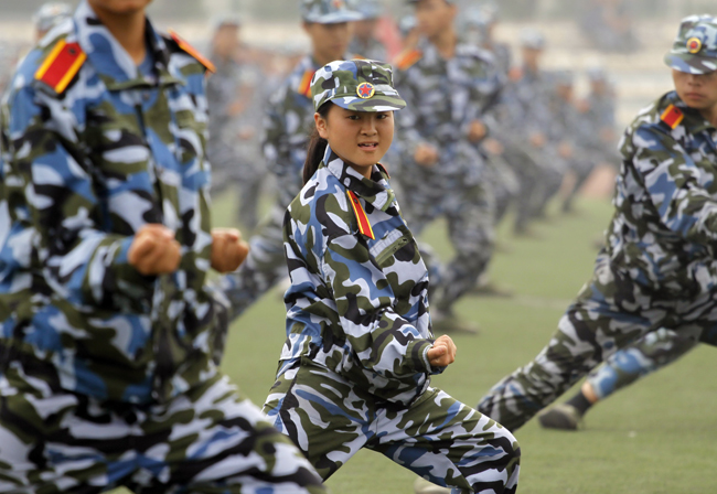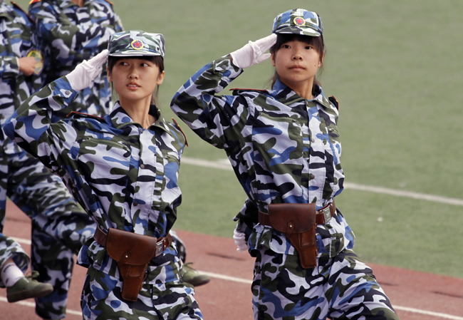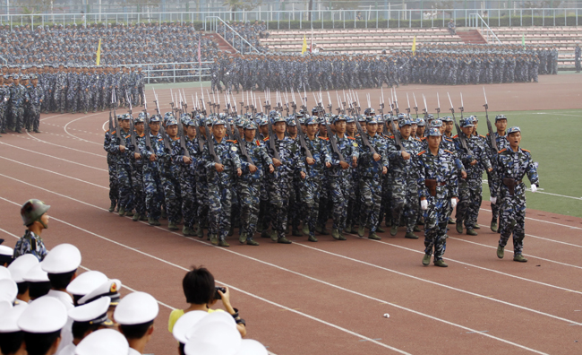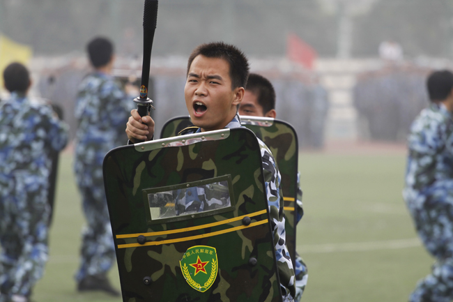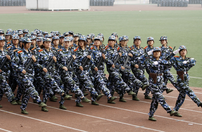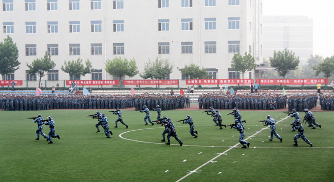 检阅完毕,伴随着激昂、雄壮的《解放军进行曲》,35个军训方队迈着矫健的步伐,精神抖擞地正步走过主席台。经过严格的军事训练,各军训方队军容严整、军姿威武,他们队型整齐、步调一致、口号响亮,赢得了学校领导和在场师生的一致好评。分列式表演后,还进行了警棍术、军体拳、战术和刺杀操等科目表演,博得了全场观众的阵阵掌声。