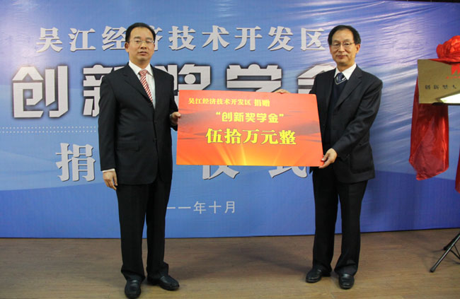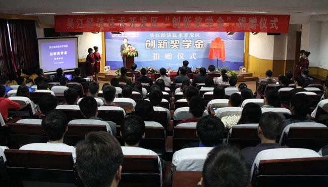 吴江经济技术开发区“创新奖学金”捐赠仪式于10月22日在我校科技报告厅举行。我校校长刘丁,副校长李言,吴江市委常委、开发区党工委副书记、管委会副主任盛红明等出席了捐赠仪式。