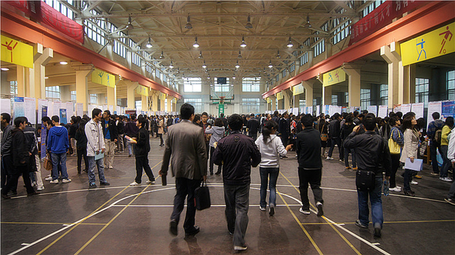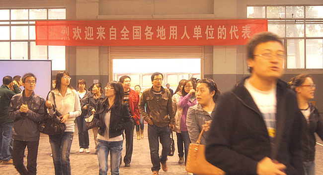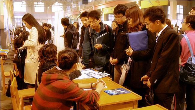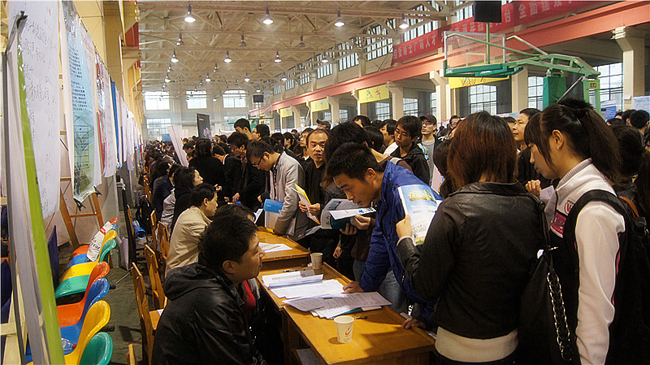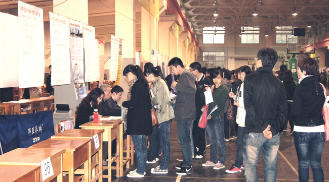 招聘会现场人头攒动,我校应届毕业生及闻讯赶来的外校同学纷纷拿着简历在众多单位中寻求心目中理想的职位,积极与各单位进行洽谈。中午14:00,记者在现场看到有的同学因为来得较晚,还未投递简历就被招聘单位告知岗位需求已满,只能遗憾的离开。