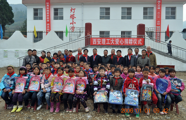 安康市汉滨区2010年7月遭受到特大洪灾,迎风乡灯塔小学校舍全部被毁。我校作为主要对口援建单位,集体和个人曾踊跃捐款,由当地政府主持小学新校舍的重建。