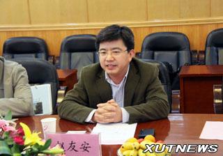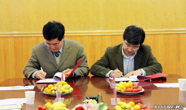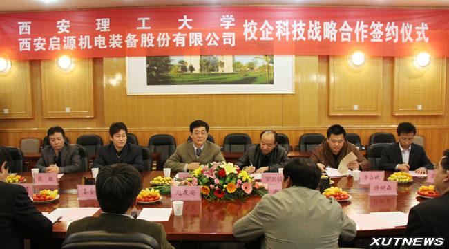 西安理工大学与西安启源机电装备股份有限公司校企科技战略合作签约仪式于11月17日在学校第二会议室举行。西安市经济技术开发区经发局局长南永春,西安启源机电装备股份有限公司董事长赵友安,我校校长刘丁、副校长罗兴锜出席了签约仪式。