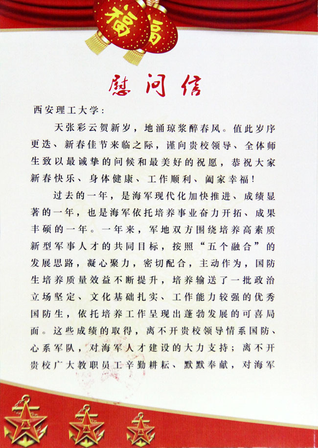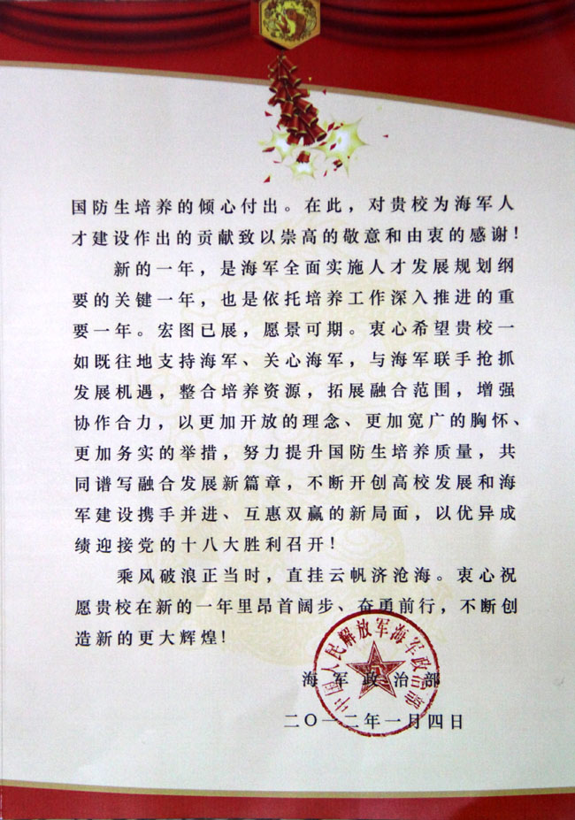 新年来临之际,中国人民解放军海军政治部向我校发来新春慰问信,对我校一年来为海军人才建设作出的贡献表示感谢,同时希望军地双方在新的一年里携手并进,不断开创高校发展和海军建设互惠双赢的新局面,以优异的成绩迎接党的十八大的召开!