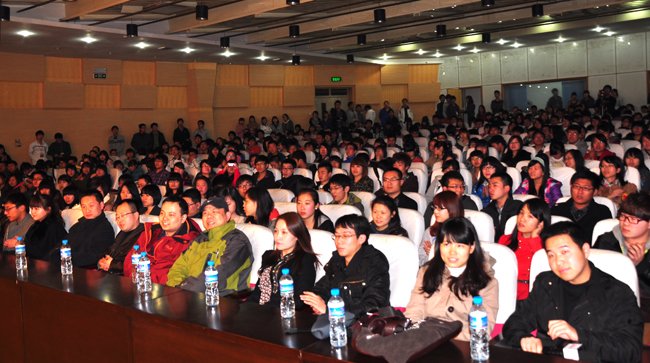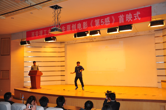 这是我校第一次以学生为全面主导,面向全校的大型学生原创电影公映活动。首映结束后,演职人员上台,各自介绍所扮演的角色和在剧组所担任的工作。他们与观众互动,以问答形式现场赠送《第5感》DVD印刷光盘。同学们纷纷上台回答问题,现场氛围火热。