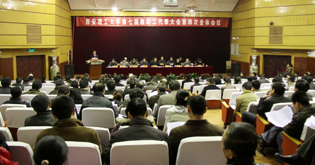 西安理工大学第七届教职工代表大会第四次会议于3月21日在我校金花校区图书馆报告厅隆重开幕。校党委书记周孝德,校长刘丁,校党委副书记、纪委书记傅有明,副校长张淼丰、刘凯、李言、刘军、许云华,总会计师赵明扬出席会议。