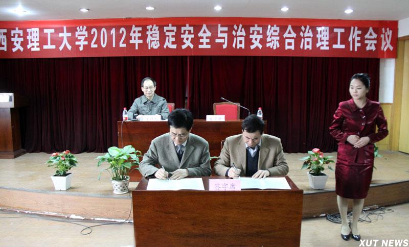 会上进行了“西安理工大学2012年稳定安全工作责任书”签字仪式,刘丁校长与4个单位的代表现场签订责任书,安排布置其余单位责任书的签订工作,全面落实了稳定安全工作责任。