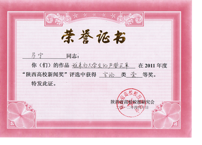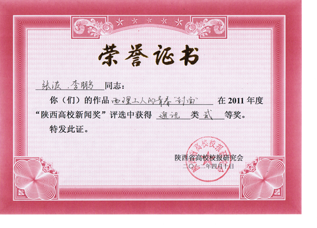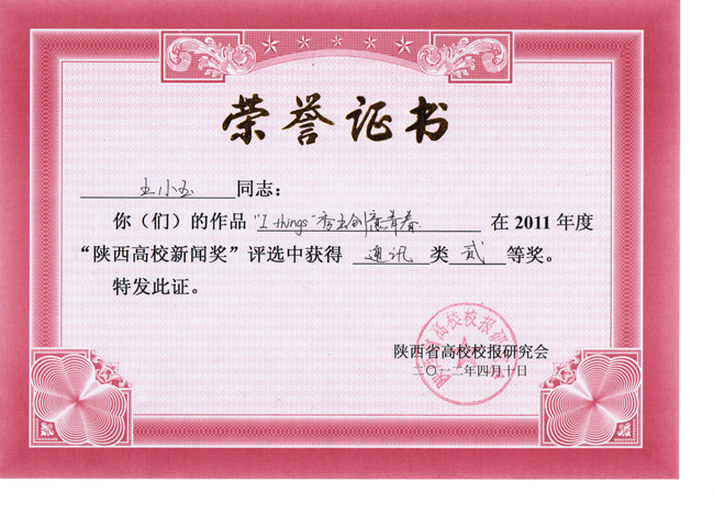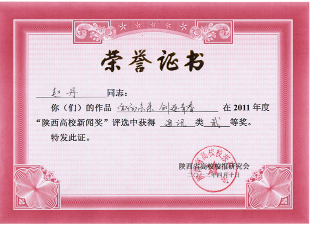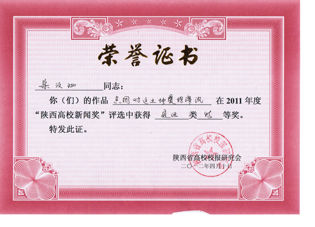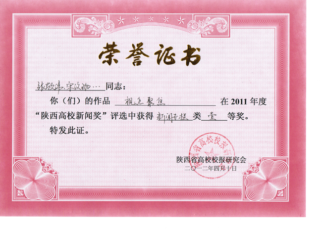“陕西高校新闻奖”是由陕西省高校校报研究会主持评选的全省高校新闻系统唯一的学术性评奖,在陕西省高校报界中向来以高规格、严要求著称,评选范围涵盖消息、通讯、言论、新闻图片、新闻专栏、版面等6个项目。2011年度“陕西高校新闻奖”共计有363件作品获奖,其中特等奖74件,一等奖109件,二等奖180件。