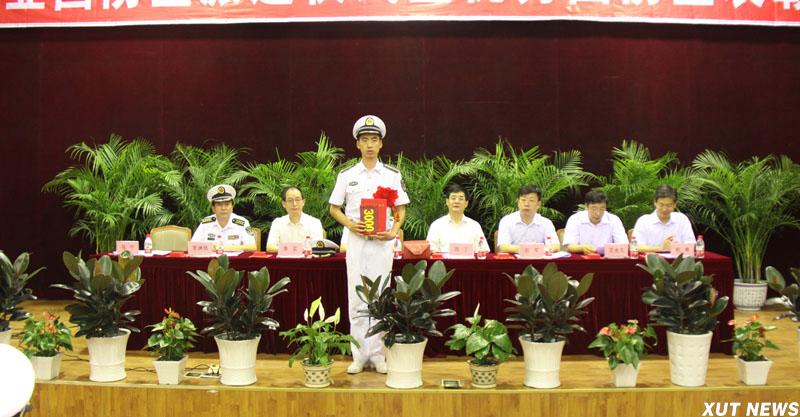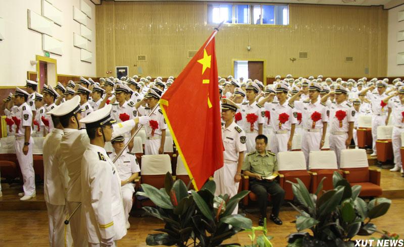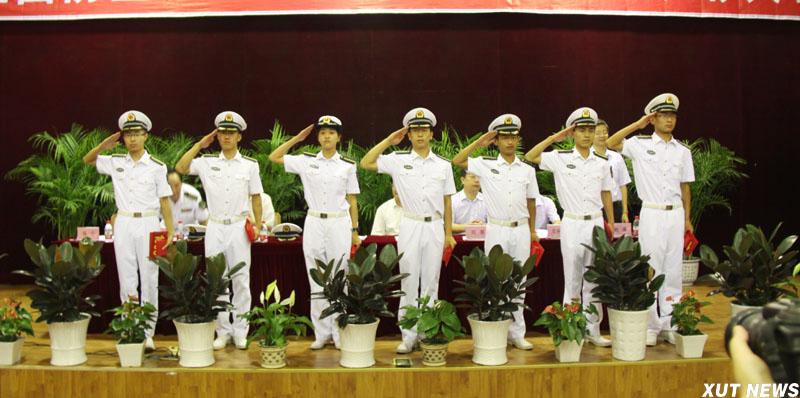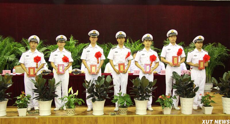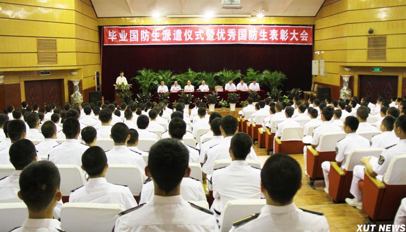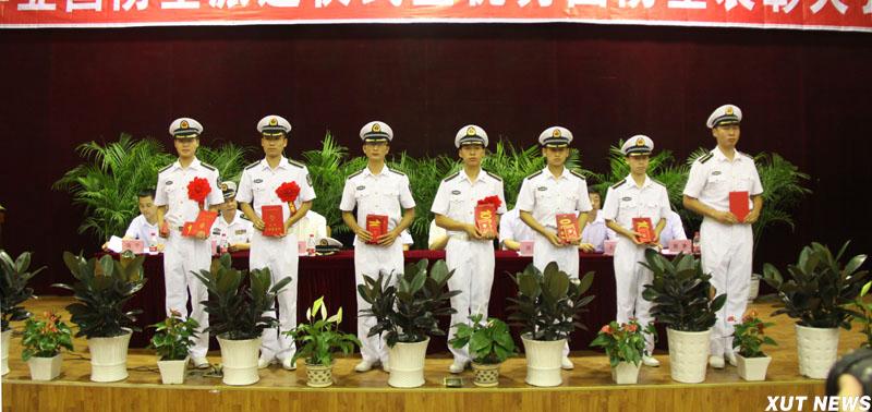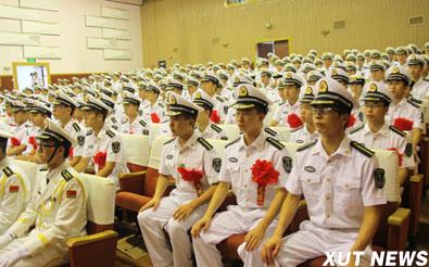 西安理工大学2012届海军国防生毕业派遣仪式暨优秀国防生表彰大会7月5日在金花校区图书馆报告厅隆重举行。海军装备部驻西安地区军事代表局副局长闫灵大校,我校校长刘丁,副校长李言、刘军,驻我校选培办主任李洲强出席大会。大会在庄严的《中国人民解放军军歌》中拉开帷幕。