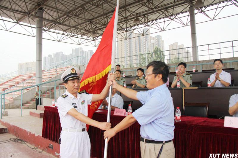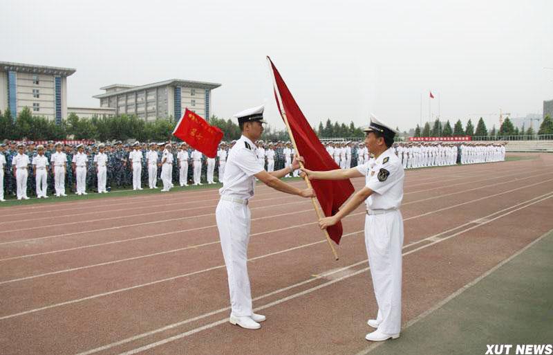 会上,校党委书记周孝德向军训旅授予了军旗。军训旅旅长、海军驻校选拔培训办公室主任李洲强大校郑重地接过了军旗。
