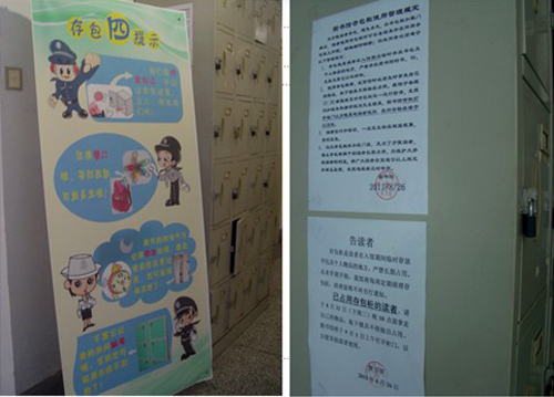 左:现在的“存包温馨四提示”宣传画,右:曾经的命令式存包规定