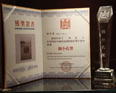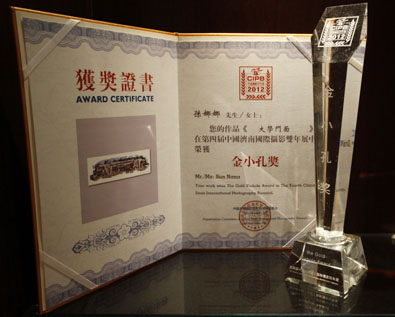 第四届中国济南国际摄影双年展暨齐鲁国际摄影周于10月12日在济南举行。我校艺术与设计学院摄影专业学生孙娜娜的作品《大学门面》获第四届世界大学生摄影展“金小孔”奖,陈子遐作品《倒影》获“铜小孔”奖,王雅欣作品《叉子》、王冬梅作品《迷幻》获入选奖。主办方同时邀请我校摄影专业陈永豪作品《88号院》、赵丽云作品《生存空间》、汪海作品《生命•划痕》、刘忠凯作品《无题》参加艺术家个人展览。