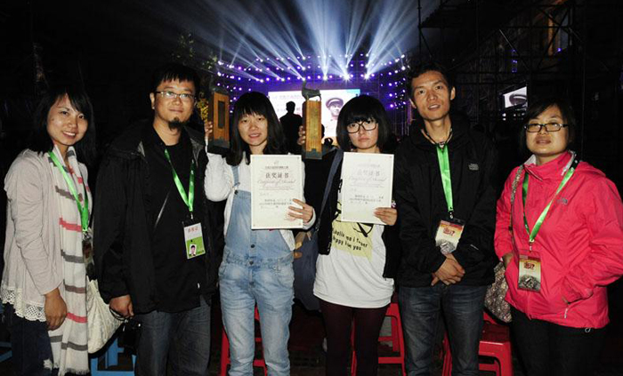摄影系师生在2012平遥国际摄影大展颁奖典礼上,左起:彭敏、张辉、赵丽云、汪海、罗斌、王惠英。 梁毅 摄