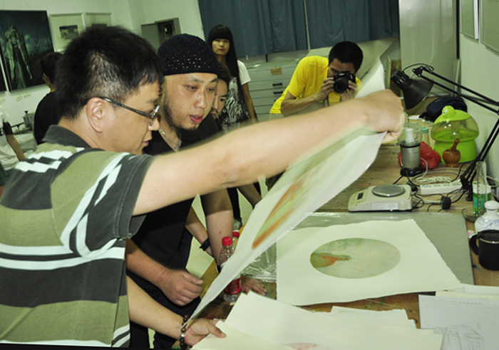 艺术家马良(右)观看艺术与设计学院师生摄影作品